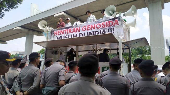 RIAUMANDIRI.ID, JAKARTA – Massa gabungan dari FPI, GNPF dan PA 212 berdemo di depan kantor Kedutaan Besar India, Kuningan, Jakarta Selatan pada Jumat (6/3/2020) siang.