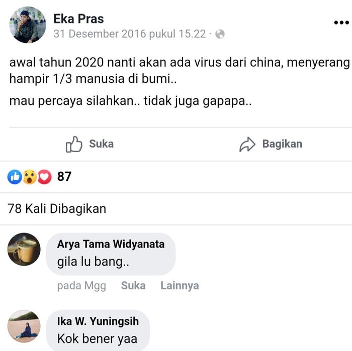 "awal tahun 2020 nanti akan ada virus dari China, menyerang hampir 1/3 manusia di bumi. Percaya silahkan, tidak juga gapapa," tulis Eka pada 31 Desember 2016, seperti yang dilihat detikcom, Selasa (10/3/2020).