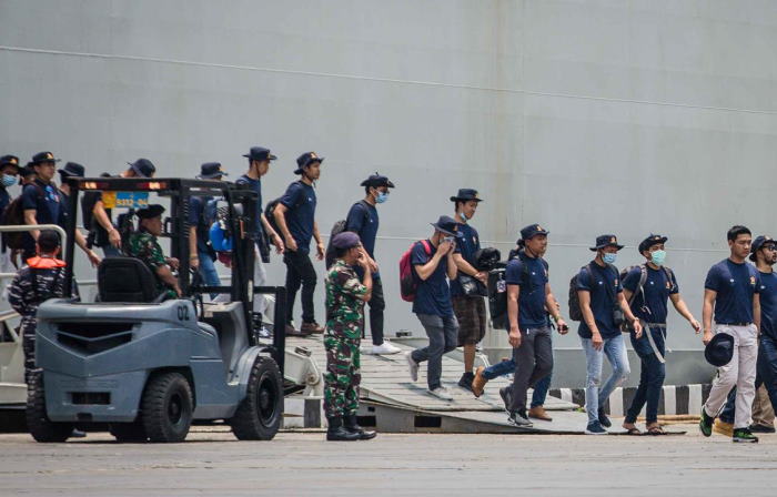 Pantauan pada Sabtu (14/3/2020), para ABK tiba di Komando Lintas Laut Militer (Kolinlamil), Jalan Pelabuhan Tanjung Priok, Jakarta Utara sekitar pukul 11.27 WIB. Mereka diantar oleh KRI Semarang-594.