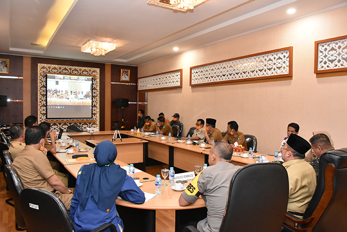 RIAUMANDIRI.ID, BENGKALIS - Gubernur Riau H Syamsuar didampingi Wakil Gubernur Riau Edy Natar Nasution, Kapolda Riau Irjen Pol Agung Setya Imam Efendi, Danrem 031/WirabimaBrigjen TNI Muhammad Fajar, beserta pejabat di lingkungan Pemprov Riau melakukan video konferensi (vidkon) dengan bupati/wali kota se Provinsi Riau, guna membicarakan kesiapan penanganan serta upaya pemutus rantai penyebaran virus corona (covid-19), Senin (23/3/2020).