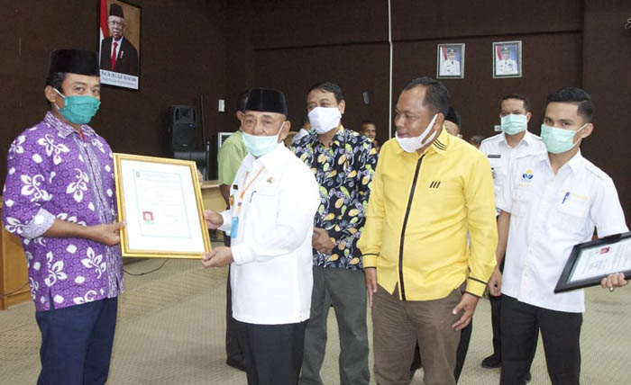 RIAUMANDIRI.ID, PELALAWAN - Para penangkar bibit buah memperoleh sertifikat dari Pemerintah Kabupaten Pelalawan. Sertifikat diserahkan langsung Bupati Pelalawan, HM Harris kepada dua kelompok penangkar, yakni Balai Pelatihan dan Pengembangan Usaha Terpadu (BPPUT) PT Riau Andalan Pulp and Paper (RAPP) dan Kelompok Tani Benih Andalan Pangkalan Kerinci, Rabu (6/5/2020), di Auditorium Kantor Bupati, Pangkalan Kerinci, Kabupaten Pelalawan.