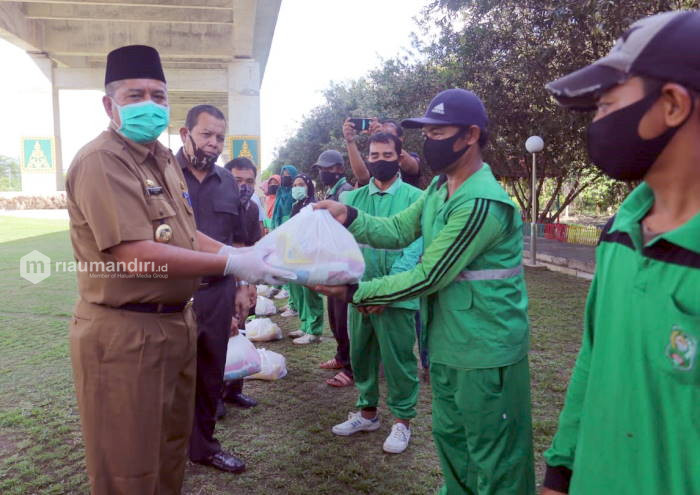 Bantuan sembako sederhana tersebut, diserahkan secara simbolis oleh Bupati Siak Alfedri kepada THL Kebersihan di Siak, yang dilaksanakan di taman Tengku Agung, Kecamatan Siak, Selasa (12/5/2020).