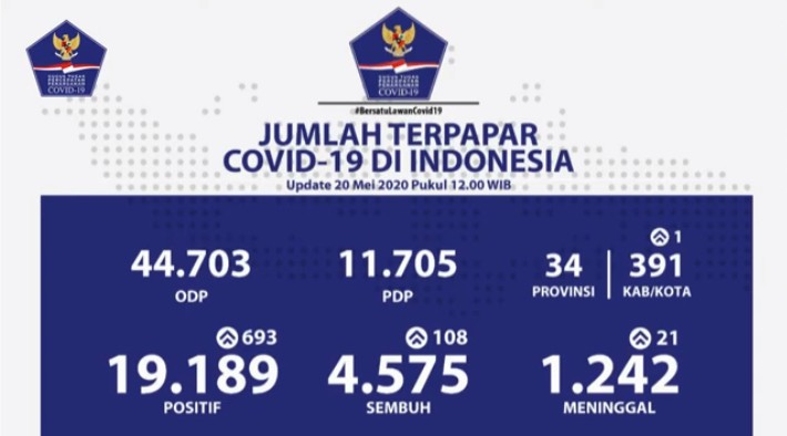 Sehingga total kasus virus Corona COVID-19 di Indonesia saat ini mencapai 19.189 kasus. Sementara angka sembuh sebanyak 4.575 kasus dan meninggal sebanyak 1.342 kasus.