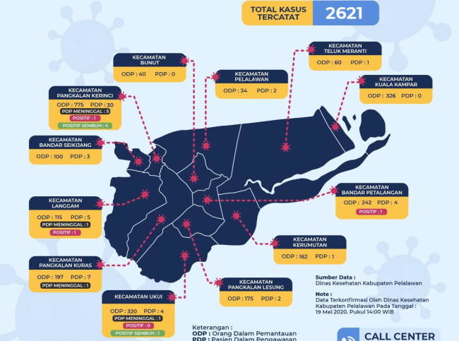 Menurut data terbaru yang diterima dari Pusat Informasi dan Koordinasi Covid-19 Kabupaten Pelalawan per tanggal 20 Mei 2020, pasien positif Covid-19 masih tetap berjumlah 8 orang, masih dalam perawatan berjumlah 3 dan sembuh, sudah dibenarkan pulang 5 orang.