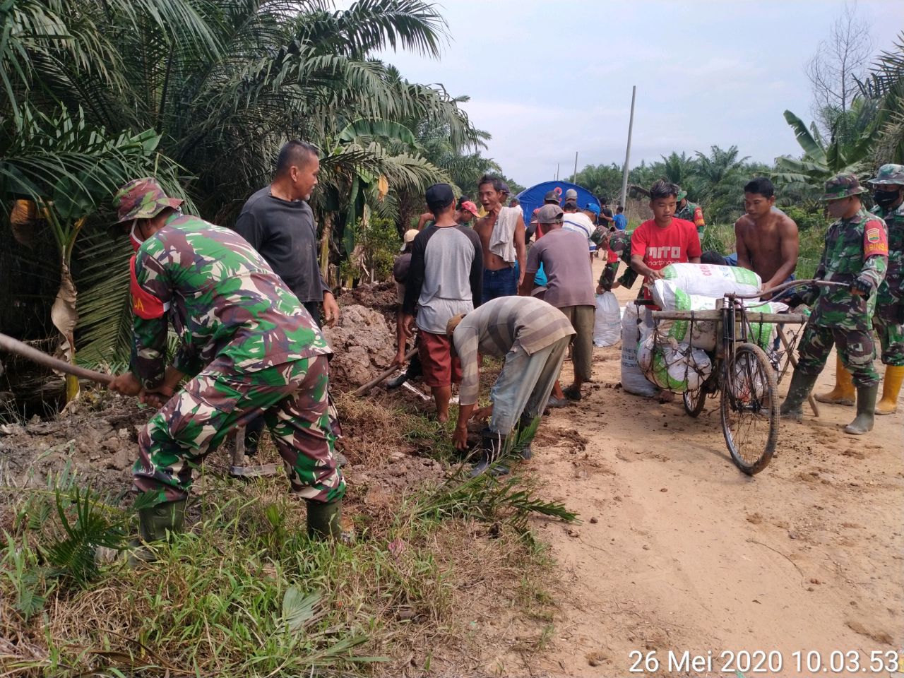 Koramil 05/Rimba Melintang yang dipimpin Danramil Kapten Czi A. Panjaitan bersama aparat kepenghuluan dan warga bahu membahu melaksanakan gotong royong pembuatan tanggul penahan air yang terbuat dari karung berisikan tanah.