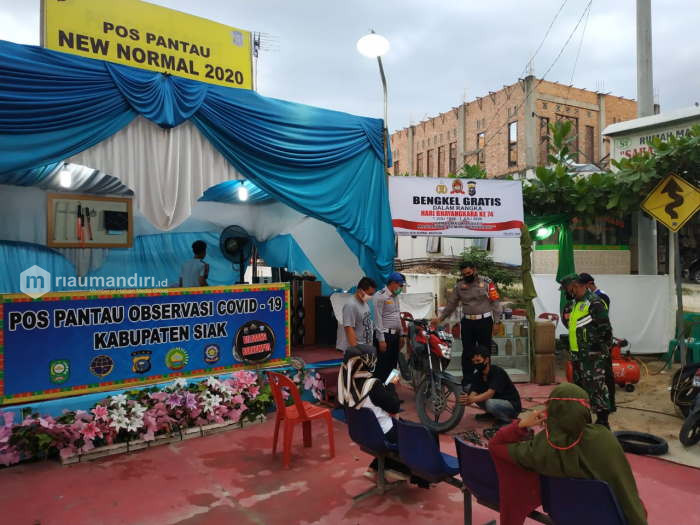 RIAUMANDIRI.ID, SIAK - Dalam rangka menyambut hari Bhayangkara ke-74, Polsek Tualang Polres Siak menyediakan layanan Bengkel Gratis bagi pengendara roda dua yang melintas di Pos Pantau New Normal Kampung Tengah Maredan, Kecamatan Tualang.