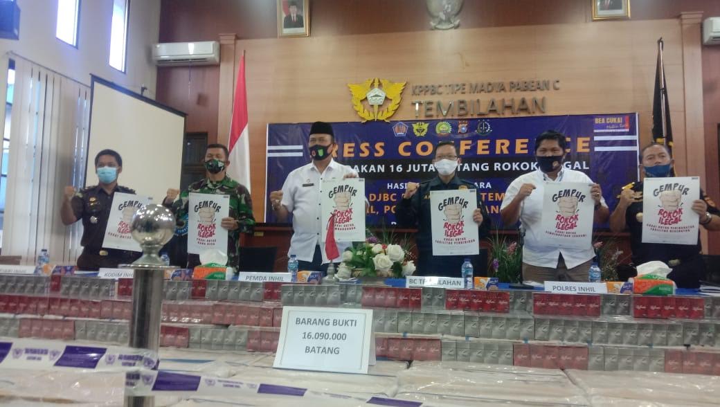 Saat konferensi pers capaian atas penindakan 16 juta batang rokok ilegal hasil sinergi Kanwil DJBC Riau, KPPBC Tembilahan, Kodim 0314, Polres, Kejari Inhil, kembali wartawan mencoba mengkonfirmasi langsung kepada Kepala KPPBC Ari Wibowo Yusuf yang hadir saat itu, Rabu (15/7/2020).