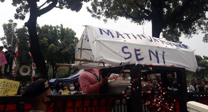 Pekerja Seni Jakarta Demo Bawa Keranda Mayat ke Depan Kantor Anies