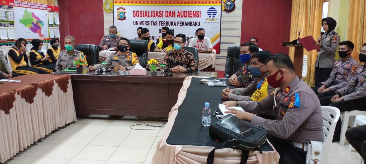 RIAUMANDIRI.ID, TELUK KUANTAN - Dalam rangka menyongsong era globalisasi khususnya dunia pendidikan serta dalam membentuk Polri yang profesional serta memenuhi standar kualitas anggota Polri, maka dilaksanakan sosialisasi dan audiensi oleh Universitas Terbuka dari Pekanbaru.