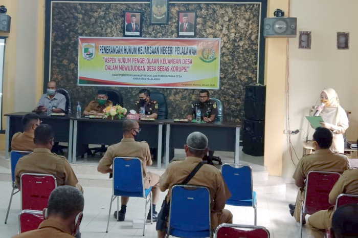 RIAUMANDIRI.ID, Pangkalan Kerinci - Dinas Pemberdayaan Masyarakat Desa (DPMD) Kabupaten Pelalawan, Riau bersama dengan Kejaksaan Negeri (Kejari) menggelar penerangan hukum yang berorentasi pada aspek hukum pengelolaan keuangan desa dalam mewujudkan desa bebas korupsi bagi Kepala Desa (Kades) di Tiga Kecamatan yakni Kecamatan Langgam, Bandar Seikijang dan Pangkalan Kerinci, bertempat di Aula DPMD, Selasa (28/7/2020).