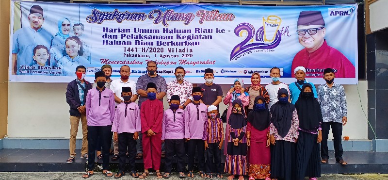 RIAUMANDIRI.ID, PEKANBARU - Keluarga besar Harian Umum Haluan Riau (Haluan Media Group) melaksanakan pemotongan hewan kurban, Sabtu (1/8/2020). Pada kegiatan itu sekaligus pemberian santunan kepada anak yatim. Kegiatan itu bersempena dengan perayaan Hari Raya Idul Adha 1441 Hijiriah/2020 dan HUT Haluan Riau ke 20.