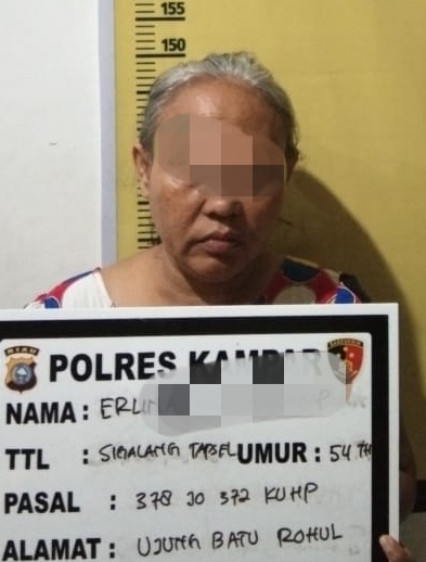 "Saat ini tersangka ER dan barang bukti telah diamankan di Mapolres Kampar dan dalam waktu dekat akan diserahkan ke Jaksa Penuntut di Kejaksaan Negeri Kampar. Tersangka dijerat dengan pasal 378 junto pasal 372 KUH Pidana dengan ancaman hukuman penjara maksimal selama 4 tahun," pungkas Kapolsek Tapung Hulu.