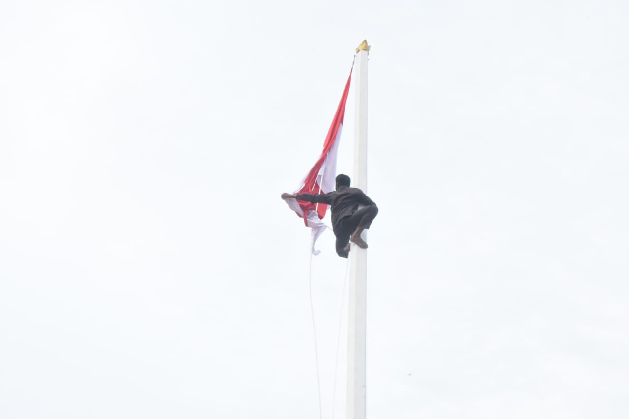 Tanpa basa-basi, ayah dari dua anak ini mengambil ujung tali bendera, kemudian memanjat ke tiang bendera. Pemandangan itu tentu mengundang rasa cemas seluruh peserta upacara.