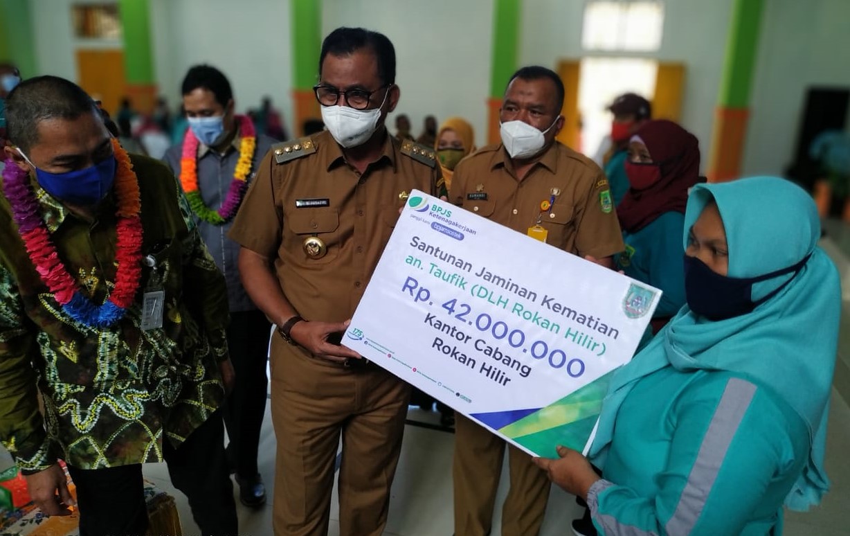 "Siang ini (Selasa siang, red) di Kantor DLH kami menyerahkan kartu BPJS ketenagakerjaan sekaligus memberikan santunan kematian bagi petugas yang meninggal dunia yang merupakan peserta BPJS," kata Kadis LH Rohil, Suwandi, SSos, Selasa (22/9/2020).