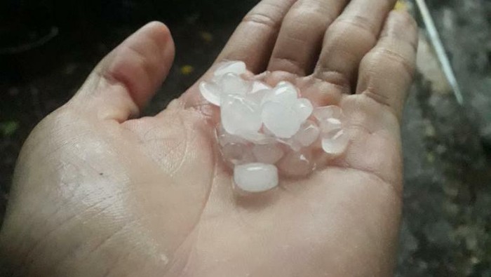 "Awalnya kan hujan biasa, saya lagi bersih-bersih lantai, karena kan agak banjir yah lantainya. Nah pas lagi bersih-bersih, tiba-tiba itu hujan es. Berisik itu suaranya nimpa asbes. Bentuknya es, besarnya kaya kelereng gitu," kata Sugandi.