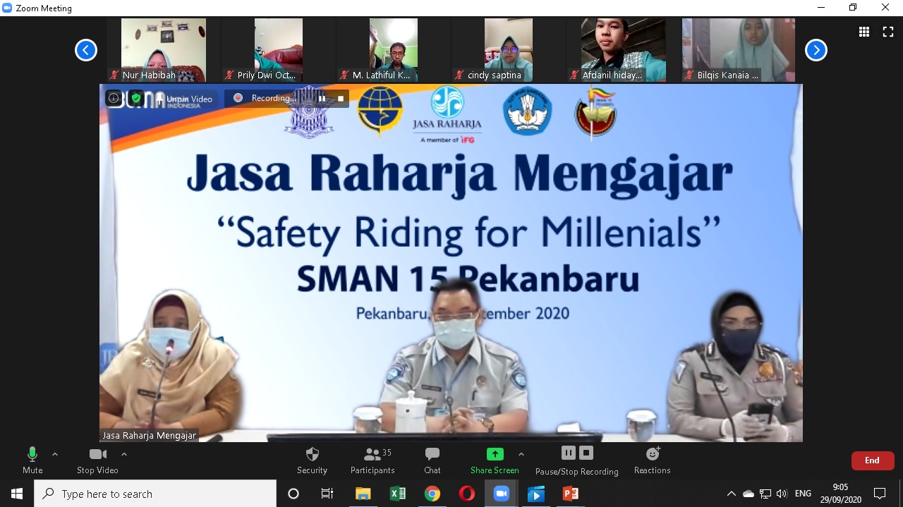 RIAUMANDIRI.ID, PEKANBARU - Jasa Raharja Cabang Riau kembali melakukan kegiatan JR Mengajar Virtual untuk kedua kalinya di bulan ini. Kegiatan ini diikuti 50 siswa/i SMAN 15 Pekanbaru di kediaman masing masing.