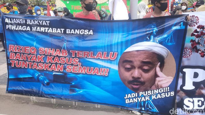 Dalam aksi itu, massa membawa spanduk bertulisan 'Barisan Rakyat Bela Negara, Dukung Aparat Proses Rizieq Shihab'. Selain itu, ada juga massa yang membawa spanduk bertulisan 'Rizieq Shihab Terlalu Banyak Kasus, Tuntaskan Semua!'.