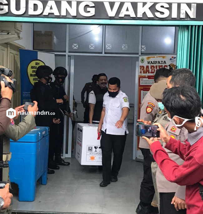 Kepala Dinas Kesehatan Provinsi Riau, Mimi Yuliani Nazir, langsung menyaksikan pengiriman vaksin Covid-19, yang dikawal ketat oleh aparat kepolisian bersenjata lengkap.