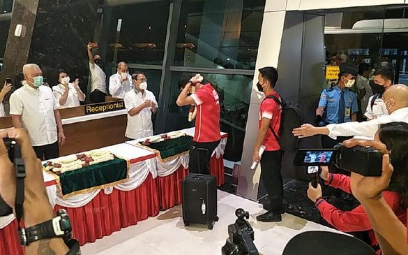 RIAUMANDIRI.CO, JAKARTA – Rombongan tim badminton Indonesia yang dipaksa mundur dari All England 2021 disambut bak pahlawan di Bandara Soekarno Hatta, Senin (22/3/2021).