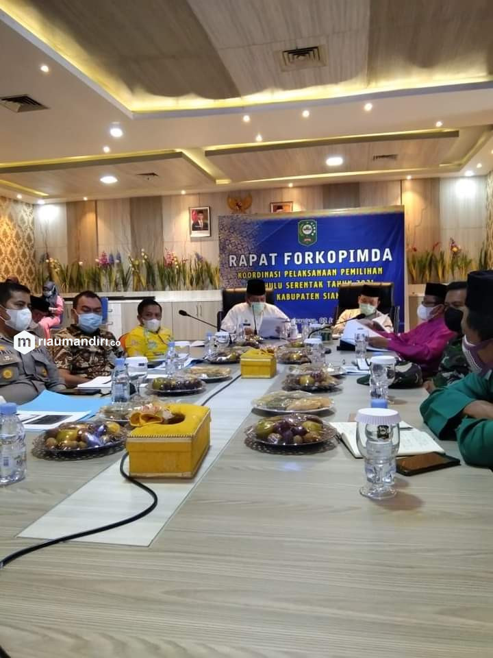 RIAUMANDIRI.CO, SIAK - Kabupaten Siak bersiap menggelar pemilihan penghulu serentak 37 desa/kampung pada 2021. Guna mematangkan persiapan pemilihan tersebut, Bupati Alfedri bersama Forkopimda mengadakan rapat persiapan sekaligus membahas mekanisme pemantauan pelaksanaan, Jumat (02/07/2021) di Ruang Bandar, Lantai II Kantor Bupati Siak.