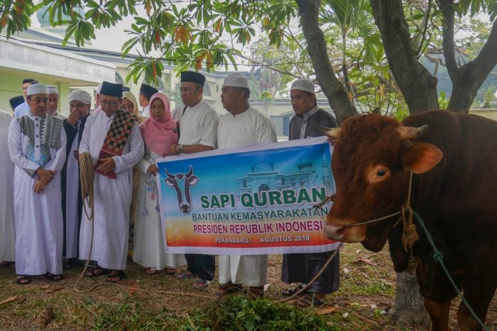 Diketahui, tahun lalu Presiden Jokowi memberikan bantuan satu ekor sapi kurban seberat 820 kilogram untuk Riau. Sapi kurban bantuan Presiden itu disembelih di Masjid Raya Annur Riau.