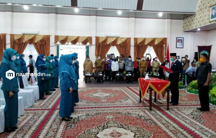 RIAUMANDIRI.CO, BAGANSIAPIAPI - Bupati Kabupaten Rokan Hilir Afrizal Sintong melantik secara resmi Pengurus Tim Penggerak Pemberdayaan Kesejahteraan Keluarga (PKK ) Rohil di Gedung Misran Rais Jalan Utama Kecamatan Bangko, Selasa (13/7/2021).