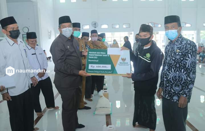 RIAUMANDIRI.CO, SIAK - Bupati Siak Alfedri mendistribusikan secara langsung Zakat Tahap III di kecamatan Bungaraya, , Selasa (7/7/2021) di Mesjid Al Muhajirin, Kampung Bungaraya.