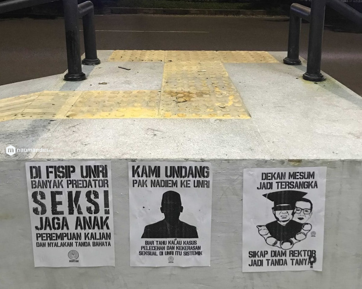 "Di Fisip Unri banyak predator seks! Jaga anak perempuan kalian dan nyalakan tanda bahaya," tertulis di poster lainnya.