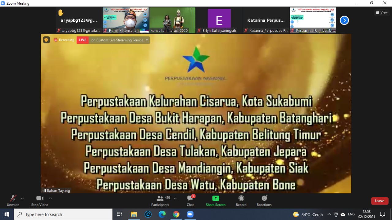 Pengumuman penghargaan tersebut disampaikan pihak Perpustakaan Nasional (Perpusnas) RI bersama Tim Pendamping Program TPBIS melalui Peer Learning Meeting (PLM) yang juga merupakan puncak pelaksanaan Program TPBIS, Kamis (2/12/2021) via virtual, yang dihadiri 600 lebih peserta dari DKPUS Provinsi, Kabupaten/Kota, dan Pengelola Perpustakaan Desa Se-Indonesia.