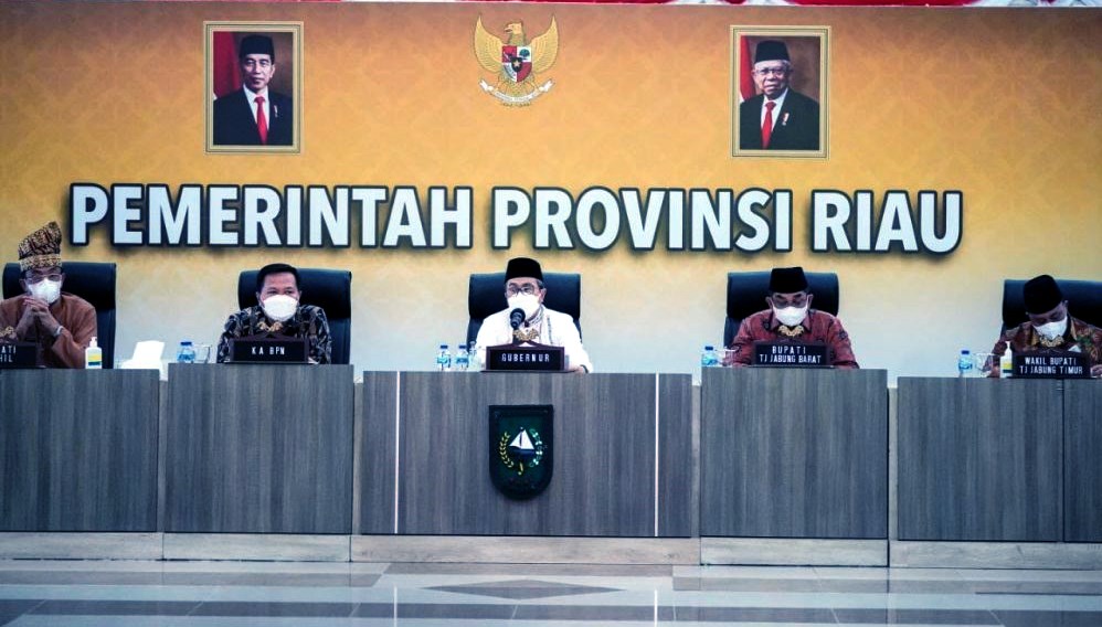 RIAUMANDIRI.CO - Gubernur Riau, Syamsuar bersama tiga kepala daerah, yakni Bupati Indragiri Hilir, Bupati Tanjung Jabung Barat dan Wakil Bupati Tanjung Jabung Timur, Provinsi Jambi, meneken kerja sama usulan pembangunan bersama, di Gedung Daerah, Balai Serindit, Jumat (11/2/2022).