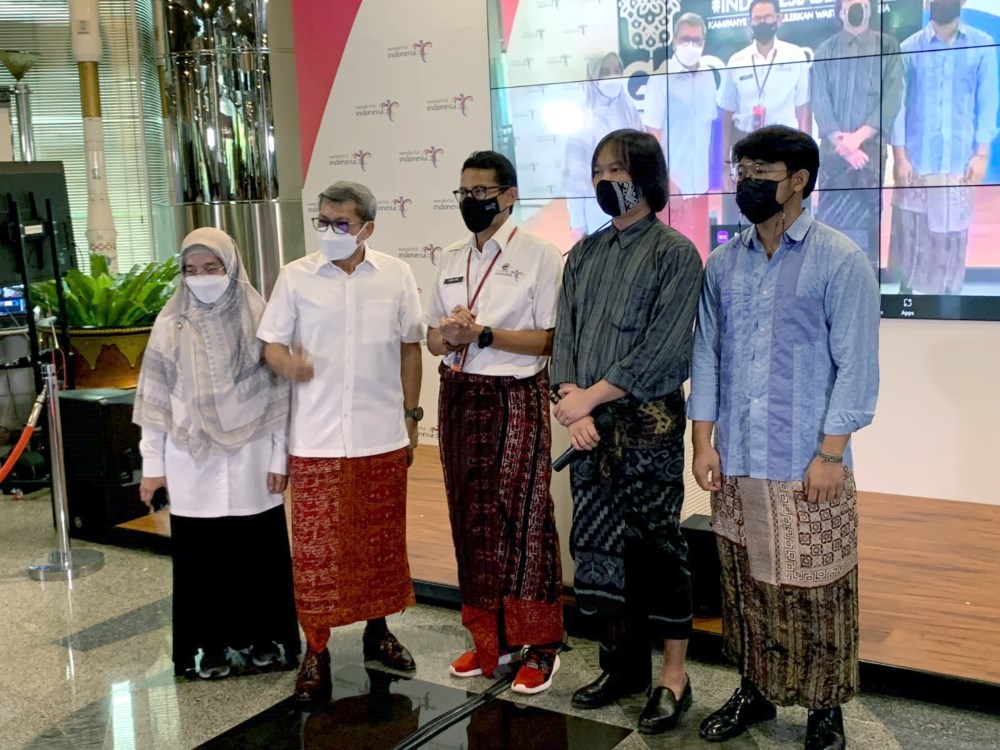 Direktur APR Basrie Kamba dan Founder Swara Gembira, Rifan Rahman dan Oi secara simbolis memberikan karya kolaborasi anak bangsa tersebut kepada Menteri Sandiaga.