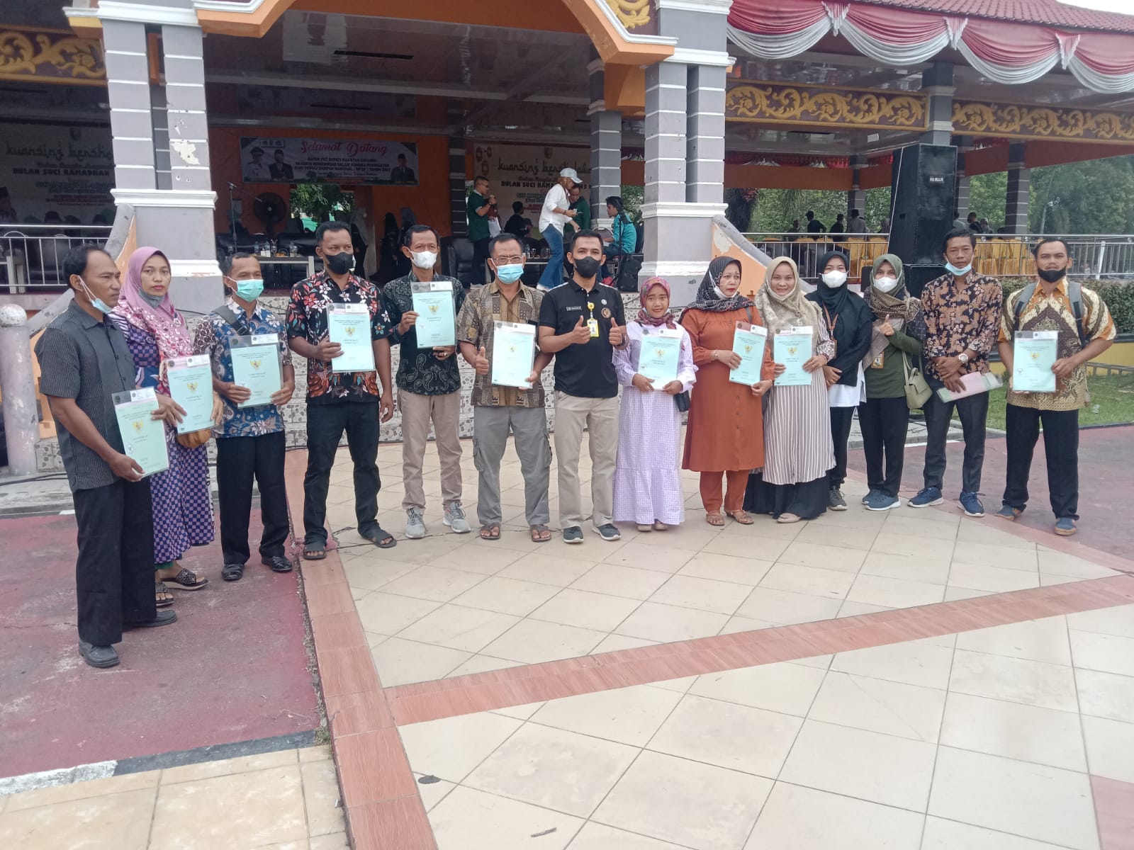 RIAUMANDIRI.CO - Plt Bupati Kuantan Singingi (Kuansing), Suhardiman Amby menyerahkan secara simbolis 1,255 Persil Sertifikat gratis kepada masyarakat Kuansing di Lapangan Limuno Teluk Kuantan Kamis (31/03/2022).