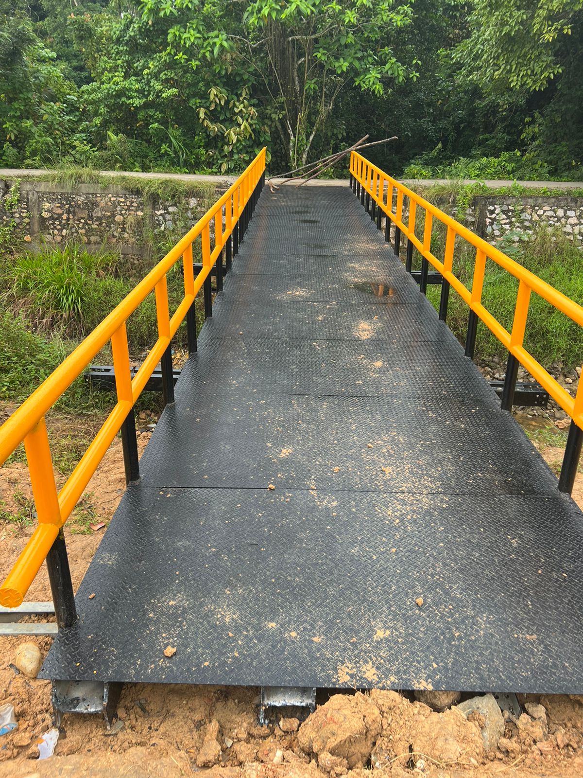 Dalam kurun waktu 2 pekan Pihak PUPR Kuansing bisa menyeselaikan jembatan darurat di posisi pancang finis tepian Narosa Telukkuantan.