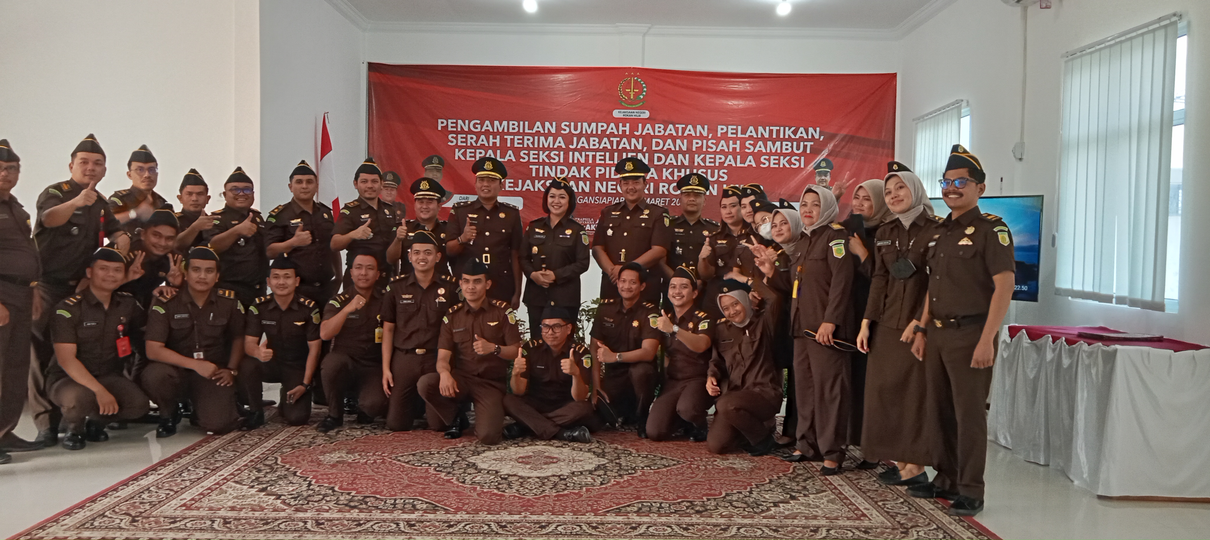 RIAUMANDIRI.CO- Kepala Kejaksaan Negeri (Kajari) Rokan Hilir (Rohil) menggelar acara Serah Terima Jabatan (Sertijab) di Gedung Kejaksaan Tinggi Negeri Rokan Hilir. Kepala Kejari Rohil, Yuliarni Appy SH MH secara langsung memimpin serah terima jabatan (Sertijab) Kepala Seksi Tindak Pidana Khusus (Pidsus) dan Kepala Seksi Intelijen, Rabu (15/3).