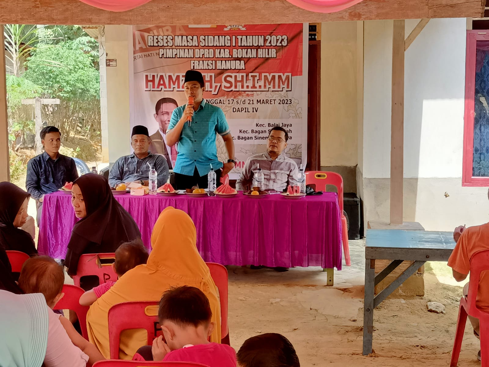RIAUMANDIRI.CO- Serap aspirasi Rakyat Wakil Ketua Dewan Perwakilan Rakyat Daerah (DPRD) Rokan Hilir (Rohil) Hamzah dari Fraksi Partai Hati Nurani Rakyat ( Hanura) mengelar kegiatan reses di sejumlah titik di Kecamatan Bagan Sinembah dan Bagan Sinembah Raya.