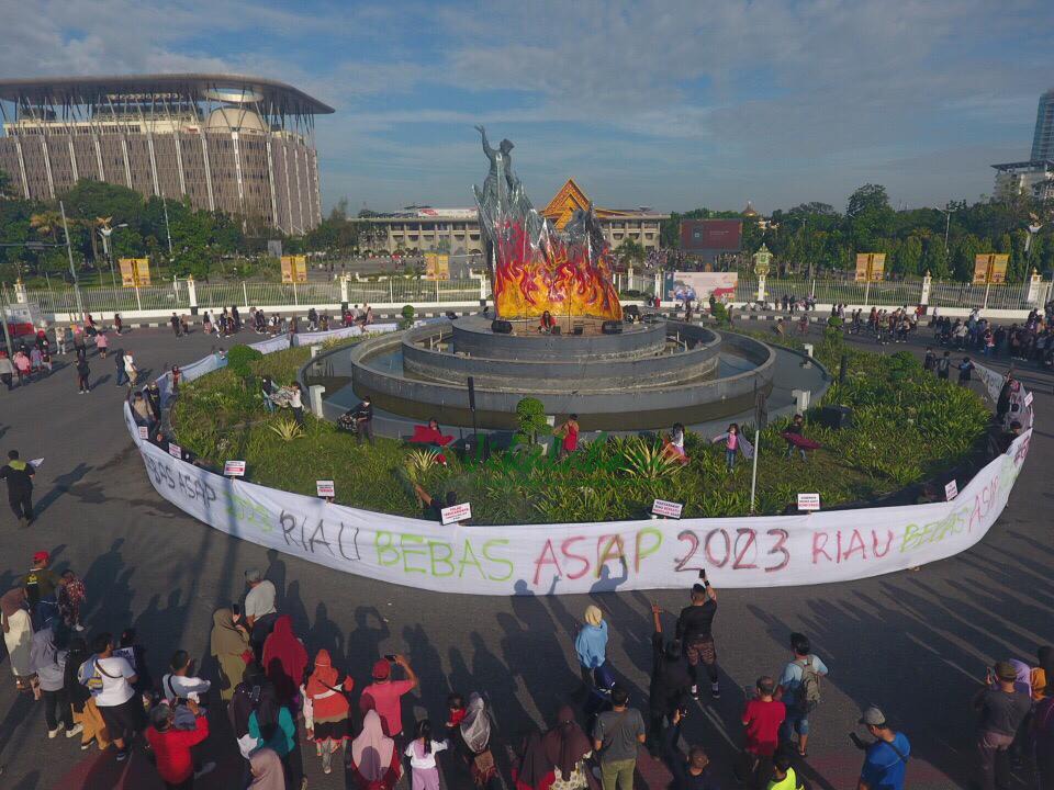RIAUMANDIRI.CO- Koalisi Masyarakat sipil, Mahasiswa, dan Seniman Riau yang tergabung dalam Gerakan Menolak ASap (Gemas) melakukan aksi dengan membentangkan sepanduk sepanjang 80 meter bertuliskan ‘Riau Bebas Asap 2023’ dan aksi teaterikal ‘Jerebu Masa Lalu’di Tugu Zapin Pekanbaru saat Car Free Day (CFD).