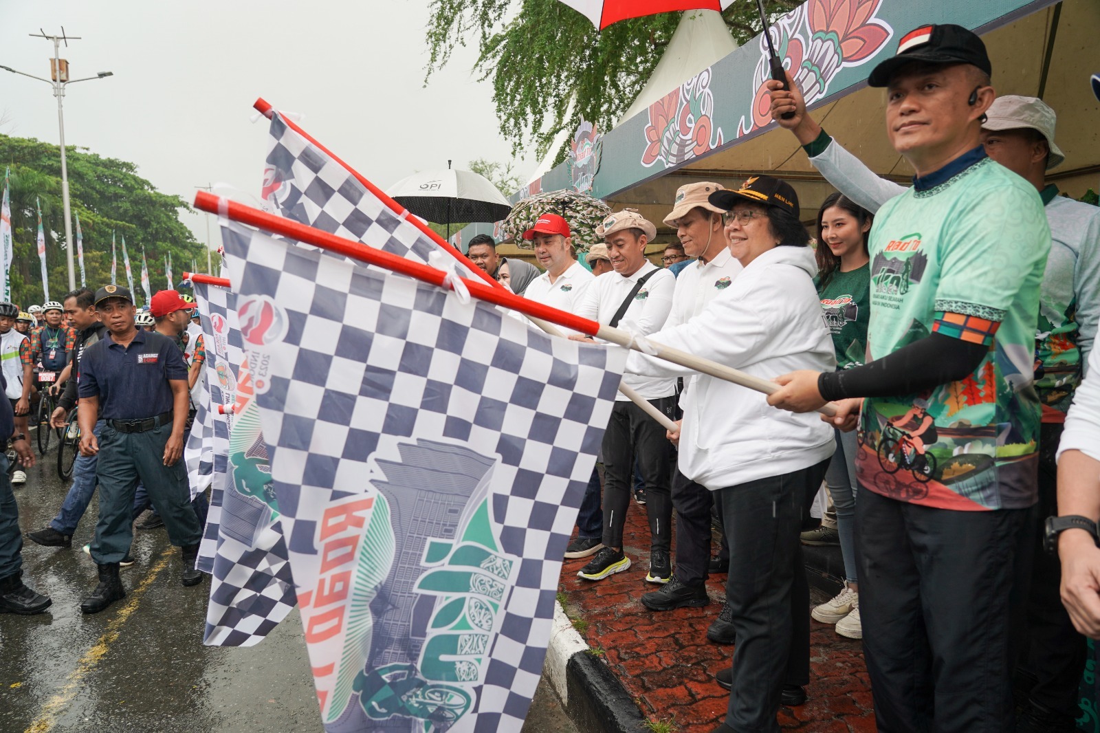 Selain Menteri LHK, Kepala BRGM, Hartono Prawiraatmaja, Dirjen PPKL KLHK, Sigit Reliantoro, Kapolda Kaltim, Irjen Pol Imam Sugianto dan lainnya turut melepas peserta fun rice bike di tengah guyuran hujan di Lapangan Merdeka Balikpapan.
