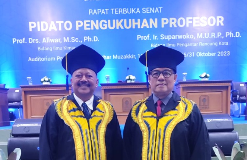 RIAUMANDIRI.CO - Universitas Islam Indonesia (UII) mengukuhkan dua Guru Besar baru pada Rapat Terbuka Senat UII yang digelar pada Selasa (31/10/2023). Kedua Guru Besar tersebut adalah Prof Drs Allwar MSc, PhD di Bidang Ilmu Kimia, dan Prof Ir Ar Suparwoko, MURP. PhD IAI IAP, Bidang Ilmu Pengantar Rancang Kota.