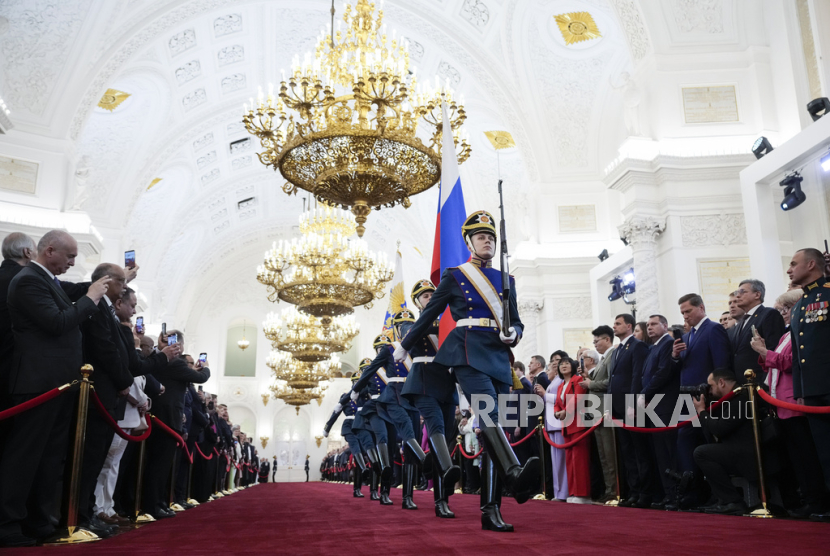 Riaumandiri.co - Upacara pelantikan Presiden Rusia Vladimir Putin dimulai di Kremlin pada Selasa, (7/5). Upacara tersebut dimulai dengan upacara pengenalan bendera nasional Rusia, bendera presiden, Konstitusi Rusia, dan lambang presiden Rusia ke Aula St. Andrew di Istana Grand Kremlin.