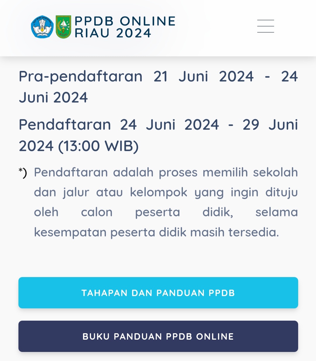 Roni menjelaskan, calon peserta didik baru sudah bisa mengikuti pra pendaftaran, di mana pada fase ini calon peserta didik baru melakukan unggah dokumen yang menjadi persyaratan sesuai jalur pendaftaran yang di pilih di situs Pendaftaran PPDB Jenjang SMA/SMK Negeri Provinsi Riau.
