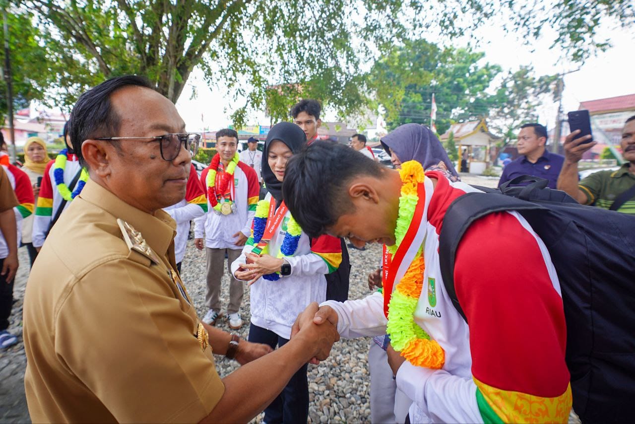 Riaumandiri.co - Pj Gubernur Riau Rahman Hadi menyambut kedatangan Atlet dan pelatih Cabang Olahraga (Cabor) Senam Riau yang berhasil meraih 6 emas, 3 perak dan 2 perunggu di Pekan Olahraga Nasional (PON) XXI Aceh-Sumut, Senin (2/9).