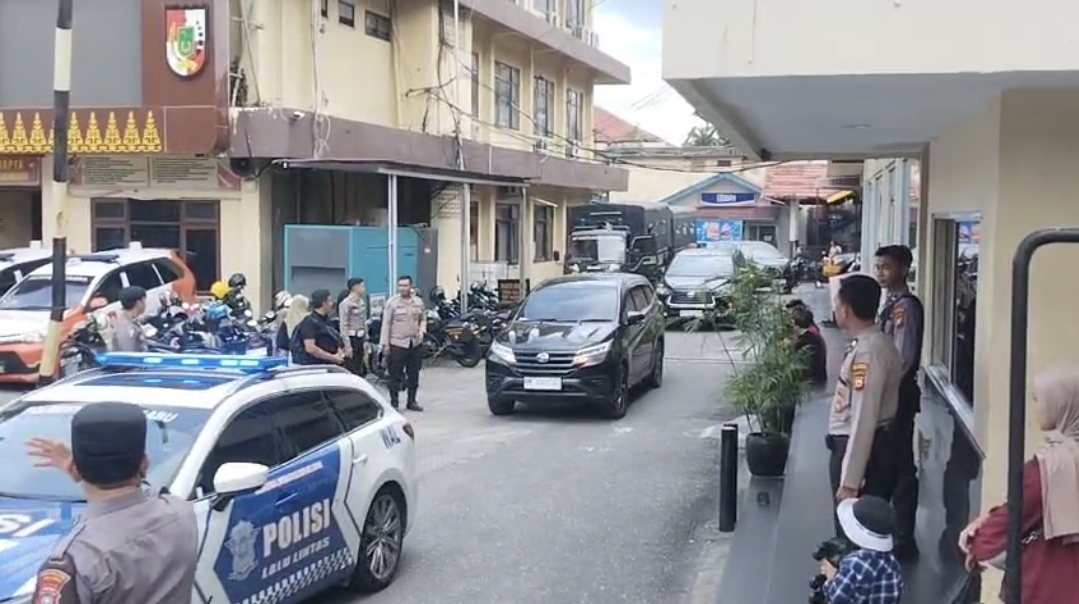 Dua unit mobil keluar yang diduga berisikan Pj Wako Pekanbaru Risnandar Mahiwa berserta pejabat lain yang terjaring OTT itu dikawal ketat oleh kepolisian.