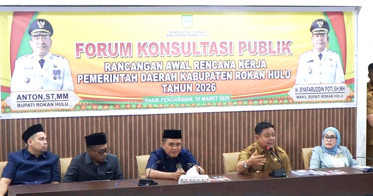 Riaumandiri.co - Melalui kegiatan Forum Konsultasi Publik Rancangan Awal Rencana Kerja Pemerintah Daerah (RKPD) Kabupaten Rokan Hulu Tahun 2026 yang diselenggarakan oleh Pemerintah Daerah, Wakil Bupati Rokan Hulu, Syafaruddin Poti berharap konsultasi publik ini dapat menjadi wadah untuk menjaring aspirasi dan masukan dari seluruh pemangku kepentingan.