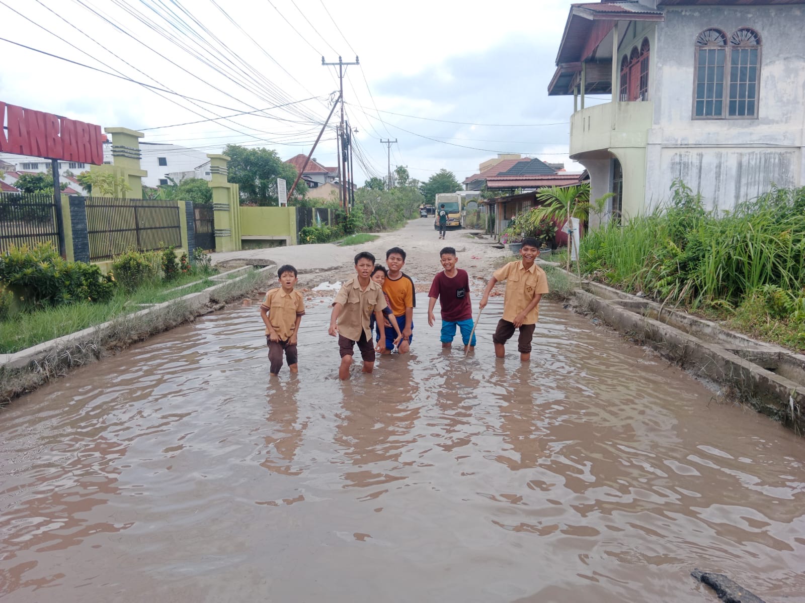 Sementara itu, di depan SDN 192 lokasi Jalan Teladan anak anak tampak bermain air dan dalam sebuah video mengatakan 'Pak Wali Kota tolong perbaiki jalan sekolah kami,' ujar anak-anak sekolah tersebut.