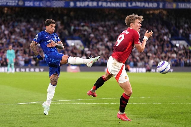 Pada menit ke-29, pemain Chelsea protes usai sepakan Enzo Fernandez di kotak penalti mengenai tangan Rasmus Hojlund. Wasit Chris Kavanagh tak menggubrisnya.