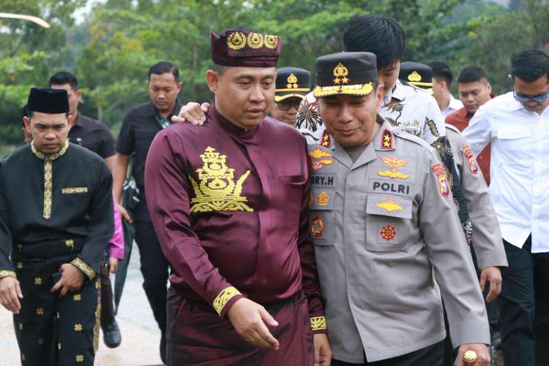 Keterangan foto: Bupati Suhardiman Amby menyambut kehadiran Kapolda Riau Irjen Pol Herry Heryawan saat menghadiri rapat paripurna HUT ke-26 Kuansing, Minggu (12/10).