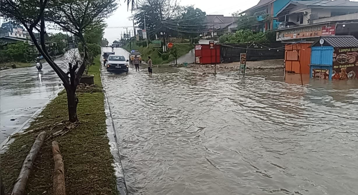 Banjir terjadi akibat hujan lebat yang mengguyur wilayah Pelalawan sejak Sabtu malam hingga Minggu dini hari. Curah hujan tinggi menyebabkan air meluap dan menggenangi badan jalan dengan ketinggian sekitar 20 hingga 25 sentimeter. Akibatnya, para pengendara terpaksa mengurangi kecepatan demi keselamatan saat melintas di lokasi tersebut.