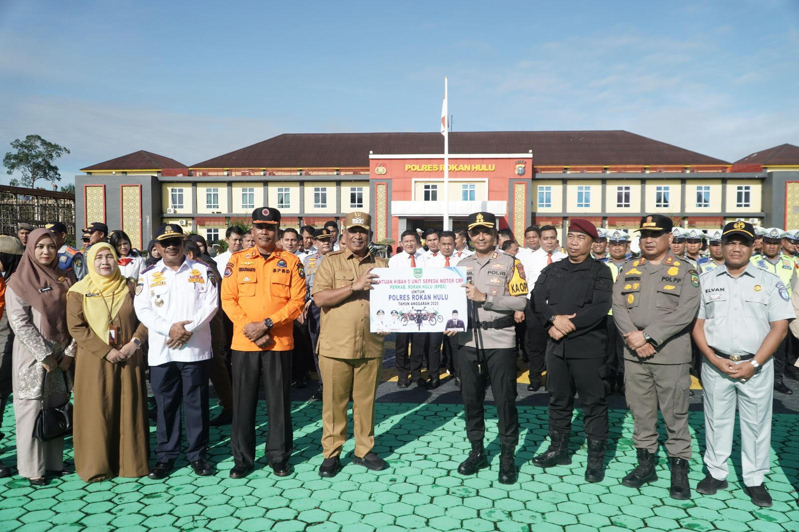 Riaumandiri.co - Bentuk dukungan terhadap pengamanan yang maksimal oleh pihak kepolisian, Bupati Rokan Hulu, Anton serahkan secara simbolis hibah 5 unit sepeda motor kepada Polres Rokan Hulu.