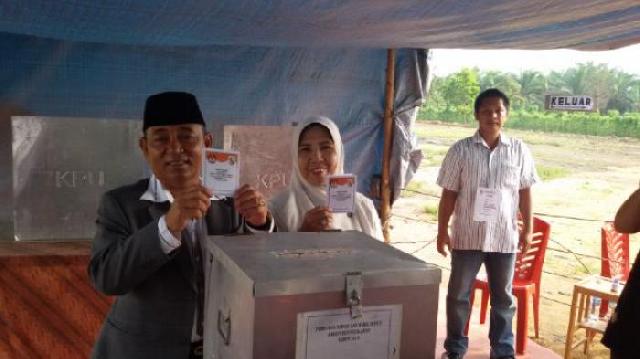 Pangkalan Kerinci (HR)-Bupati Pelalawan, HM Harris bersama istri yang juga Ketua Penggerak PKK Ratna Mainar Harris menggunakan hak pilihnya di TPS 9 Kelurahan Kerinci Barat Kecamatan Pangkalan Kerinci. Harris dan istrinya mendapat giliran pertama untuk mencoblos di TPS tersebut.