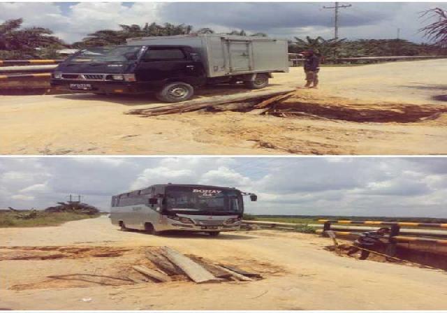 Terlihat kondisi jembatan saat ini, hanya bisa dilalui sepeda motor dan mobil pribadi saja secara bergantian, dengan sangat hati- hati. Sedangkan truk yang mengangkut hasil petani, seperti truk sawit dan karet tidak dapat melintas, karena kondisi jembatan tersebut bisa membahayakan pengguna jalan yang melintas. "Mobil pribadi aja yang bisa lewat," jelas salah satu warga sekitar jembatan.